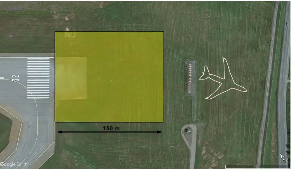 Depiction of Transport Canada's current requirement for runway end safety area on the occurrence runway with the location of the occurrence aircraft after the runway overrun (Source: Google Earth, with TSB annotations)